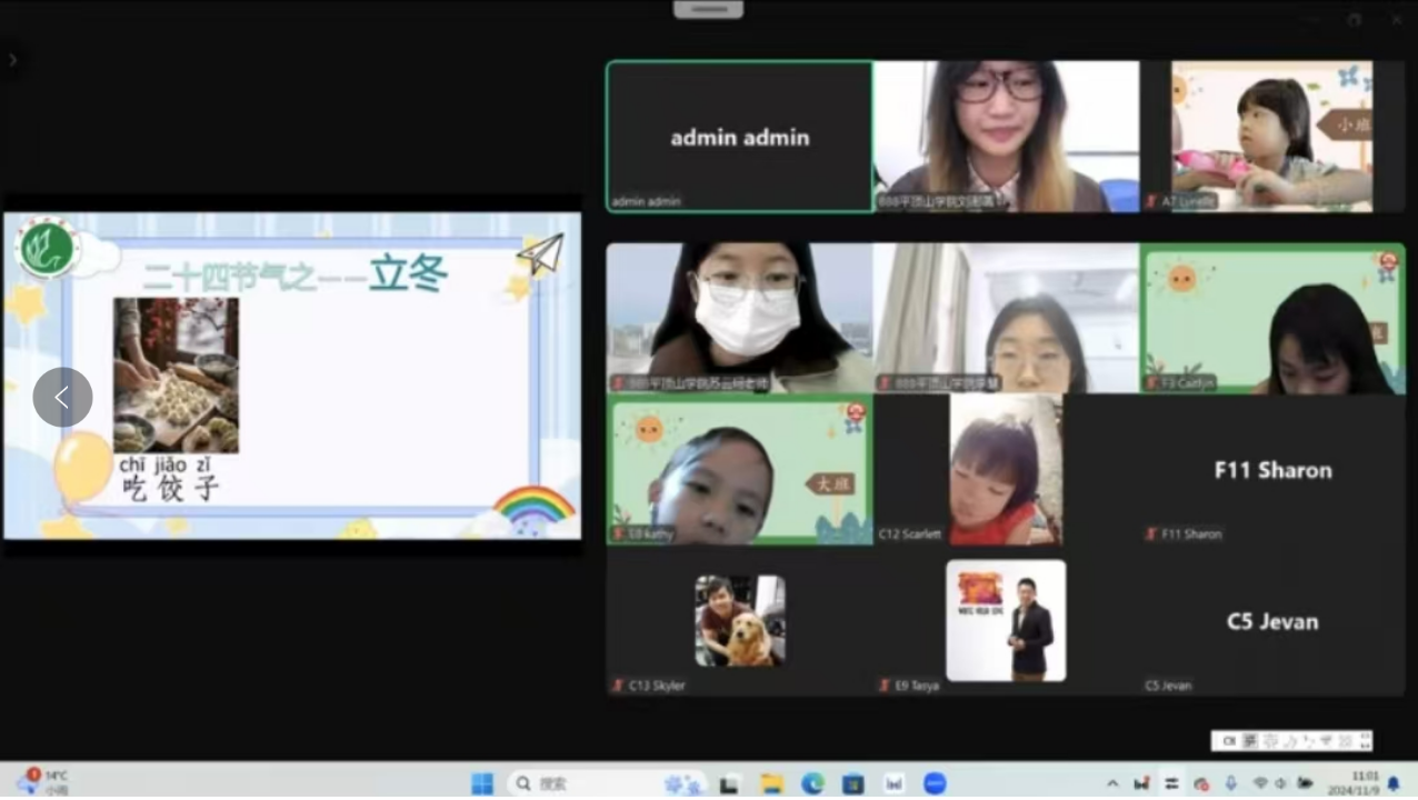问候语是人们在见面、通信时互致关心的礼貌用语,世界各种语言都有独具特色的问候语。中文问候语既有古朴典雅之风,又有下里巴人的地气,值得深入学习。课程开始,主讲教师以标准中文向印尼小朋友致以热情问候,用精美的课件和大家一起学习丰富多样的中文问候语。中华传统节气——立冬刚过,在课程进行中,刘澍菡向印尼小朋友讲解了立冬的节俗知识,介绍了这个节气里最重要的饮食习俗——吃饺子。传统节气固然跟农业生产有很大关系,但也少不了小朋友的玩乐元素,唱儿歌、玩游戏,不一而足。主讲教师和助教老师带着大家回顾了上节课学过的儿歌《丢手绢》,师生同唱一首歌,小朋友的积极性很高,课堂气氛紧张热烈。伴着歌声,老师们通过问答形式,让小朋友们在真实的中文语境中互致问候,反复练习,激发了大家的学习兴趣,课堂效果也非常明显。