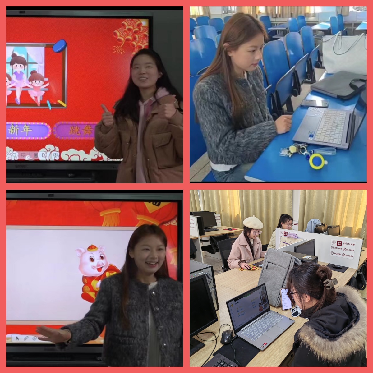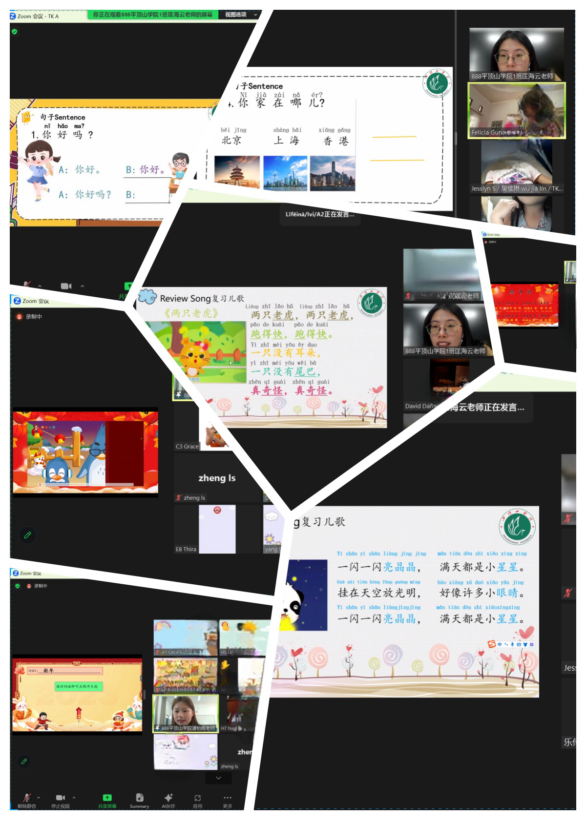 本次春季班首次面向印尼5-7岁的华裔学龄前儿童开设。学龄前儿童正处于第二外语习得的关键期,语言模仿能力和效果最佳,适合我们开展华文教育。担任此次授课任务的2022、2023级员工通过网络,第一次站在虚拟的讲台上。为了将最佳状态展示给海外学员,他们经历了长期的学习和训练,在老师的现场指导下多次磨课。当天的课程在四个教室同时开展,授课教师为印尼小朋友认真示范了“你好吗”“欢迎”“你会唱儿歌吗”“你的家在哪儿”等简单的中文问候语、问句,并让小朋友们做游戏,互相问候,模仿学习;老师们还教唱《两只老虎》《小星星》《新年好》等脍炙人口的中文儿歌,带领大家一句句学唱,注意音节、节奏、发音、口型,课堂气氛非常活跃。