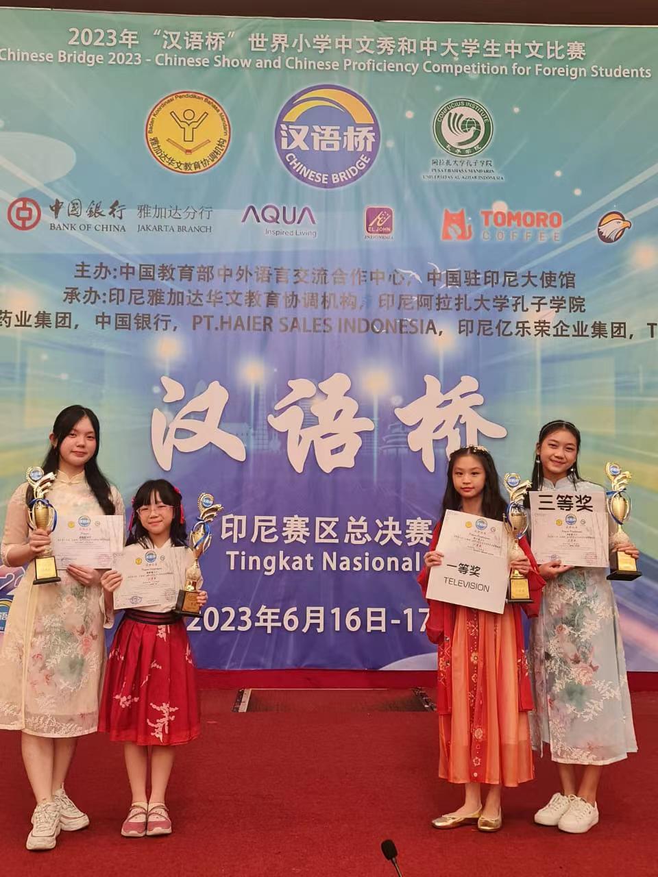 北京时间2023年6月17日,由教育部中外语言交流合作中心、中国驻印度尼西亚大使馆主办,印尼雅加达华文教育协调机构(以下简称“雅协”)和阿拉扎大学孔子公司联合承办的第二十二届“汉语桥”世界老员工中文比赛、第十六届“汉语桥”世界中员工比赛和第三届“汉语桥”世界小员工中文秀印尼赛区总决赛在印度尼西亚首都雅加达举行。由公司国际中文教育团队老师辅导的印尼员工黄子嘉获得小学组一等奖,伍劲晓获得小学组二等奖,陈嘉懿获得中学组三等奖,黄筱媃获得中学组优秀奖。