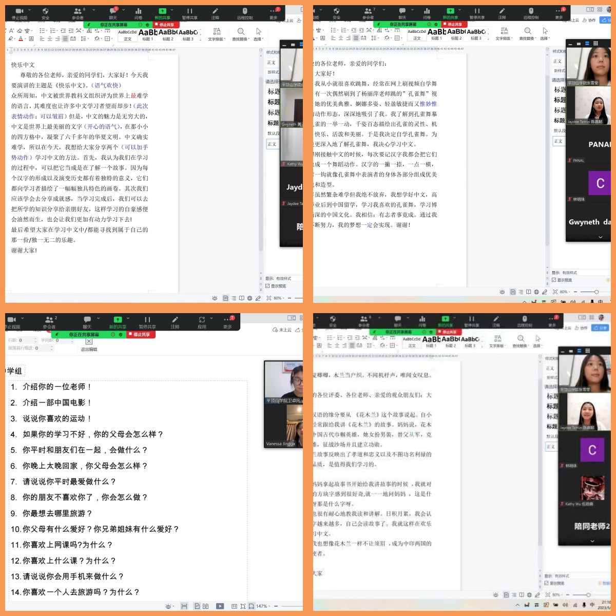 据悉,此次比赛从北京时间2023年6月15日开始,进行为期三天的比拼,共有来自印尼12个区的77位选手参加。为了比赛选手能够顺利参赛并取得优秀成绩,公司国际中文教育团队受印尼中华乐趣学苑林明珠主席所托,为来自南洋之晖公司的4位小选手进行演讲辅导。卢淑芳老师迅速成立“印尼‘汉语桥’演讲辅导”小组,成员包括2022级汉语国际教育2班张雪莹、卫卓凡。自5月27日晚上7:30开始,他们按照林明珠主席的要求,根据4位参赛选手的中文水平制定了针对性的辅导计划,对小学组的选手进行朗诵辅导,对中学组的选手进行即兴问答辅导。课堂上,两位老师帮助参赛选手修改润色演讲稿,向他们演示融入稿件演讲者思想感情的技巧。此外,两位老师还整理了常见问答题和即兴回答的技巧,带领选手模拟问答。比赛前期,来自公司旅游与规划公司的李梦洋老师、2020级汉语言文学专业路艳同学也为几位选手作了大量指导。经过多次辅导,4位参赛选手无论演讲技巧的使用,还是情感的融入,都有了明显进步。