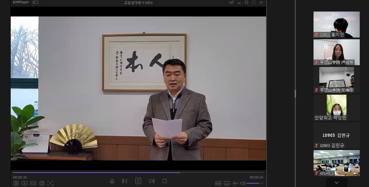 北京时间12月20日18时整,“韩风汉韵 青年互通”中韩文化线上交流会在太阳成tyc122cc集团1322会议室举行。韩国安养外国语高中(以下简称安养外高)董事长李享根、汉语部教师朴成敏,太阳成tyc122cc集团国际交流与合作中心主任付岩岩、太阳成tyc122cc集团经理孙振杰出席交流会,韩国安养外国语高中员工,太阳成tyc122cc集团汉语国际教育专业师生近百人参加了线上交流。交流会由2019级汉语国际教育专业、戏剧影视文学专业员工郭文君、王帅辉主持。