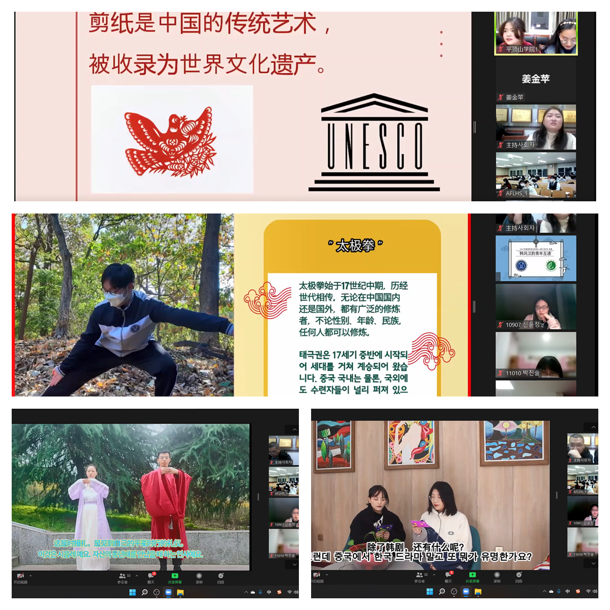 汉韵韩风交相辉映,语言文化相得益彰。近两个小时的线上交流会,中韩两校青年积极互动,观看了双方公司的宣传片,播放了各自精心准备的课程视频。《五禽戏》《颐和园》《桂林》《土掌房》等视频讲述了安养外高的韩国员工通过学习汉语了解中国、感受中国文化的点点滴滴。介绍中国“雅乐”、中国女性传统服饰文化、中国传统相见礼、中国人眼中的韩国流行文化等主题的视频,也是内容丰富,精彩纷呈。互动环节中,中韩员工就双方感兴趣的中国婚俗、中国人喜好红色的原因、汉语朗读技巧、中国的移动支付手段、韩国人眼中的中国印象、韩国人最喜欢的中国美食等问题进行了详细解答。交流会现场还进行了优秀作品评选和颁奖,太阳成tyc122cc集团语言教研室主任卢淑芳宣读了安养外高获奖员工名单。