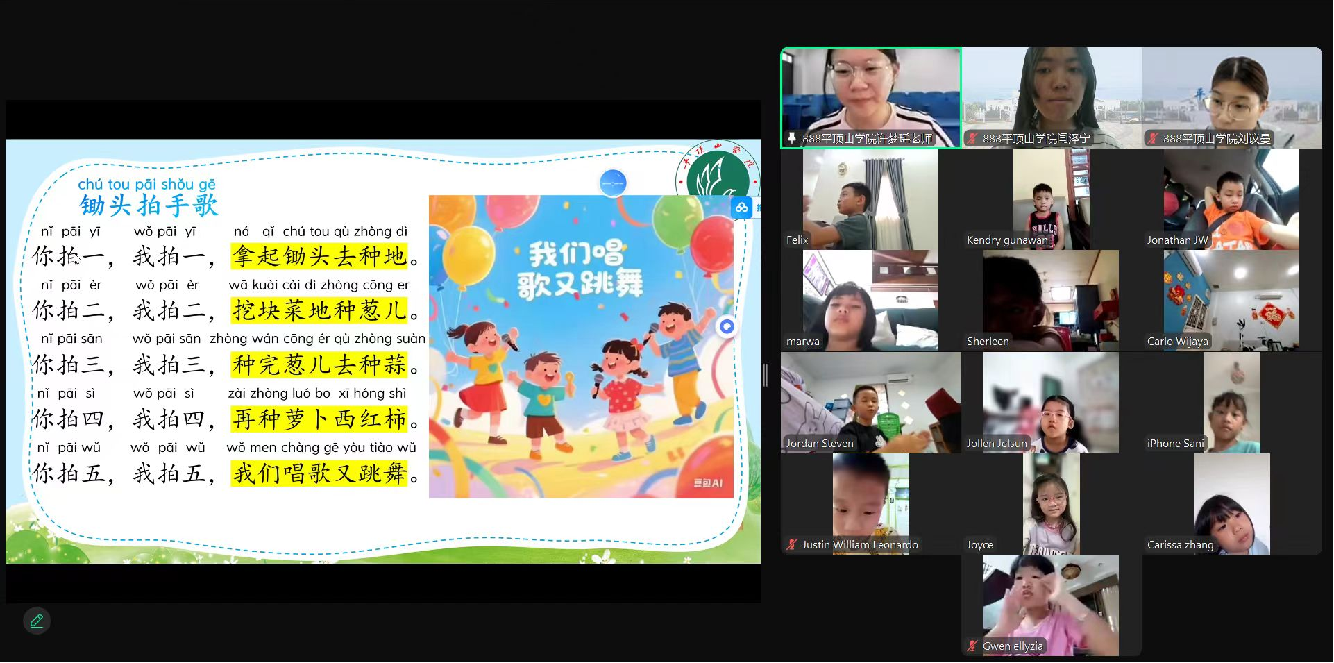 团队主讲教师充分认识到地方童谣蕴含的教学潜力,结合华裔员工年龄结构、认知水平及文化背景,将河南地方童谣作为核心载体巧妙融入教学,打造了一系列特色中文课堂。在面向印尼华裔员工的口语课上,主讲教师许梦瑶将平顶山童谣《一个锄头两面光》与海内外广为传诵的《你拍一,我拍一》融合,创造性改编为互动性强的《锄头拍手歌》:“你拍一,我拍一,拿起锄头去种地;你拍二,我拍二,挖块菜地种葱儿;你拍三,我拍三,种完葱儿去种蒜;你拍四,我拍四,再种萝卜西红柿;你拍五,我拍五,我们唱歌又跳舞。”通过韵律化的拍手游戏,华裔员工在欢快的节奏中轻松掌握了相关词汇和句式,身临其境地感受饶有趣味的劳动场景,实现了语言习得与文化体验的深度融合。在南非中文五年级“开学第一课”家乡文化分享环节,主讲教师黄宇婷以周口市非遗特产“压缩馍”引入当地童谣。在讲解了压缩馍童谣蕴含的文化寓意之后,黄老师同华裔员工唱着“压缩馍,压缩馍,小孩儿吃了考大学”,巧妙地祝愿大家在新学期能像童谣所期许的那样,“压”倒学习道路上的各种困难,不断进步,更上一层楼。此时,童谣成为了一座连接东方文化习俗与当下学习激励的桥梁。