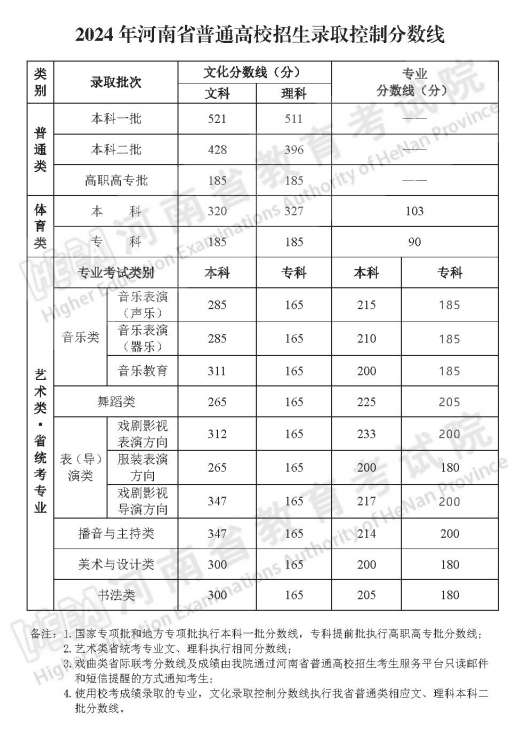 2024年河南省普通高校招生录取控制分数线