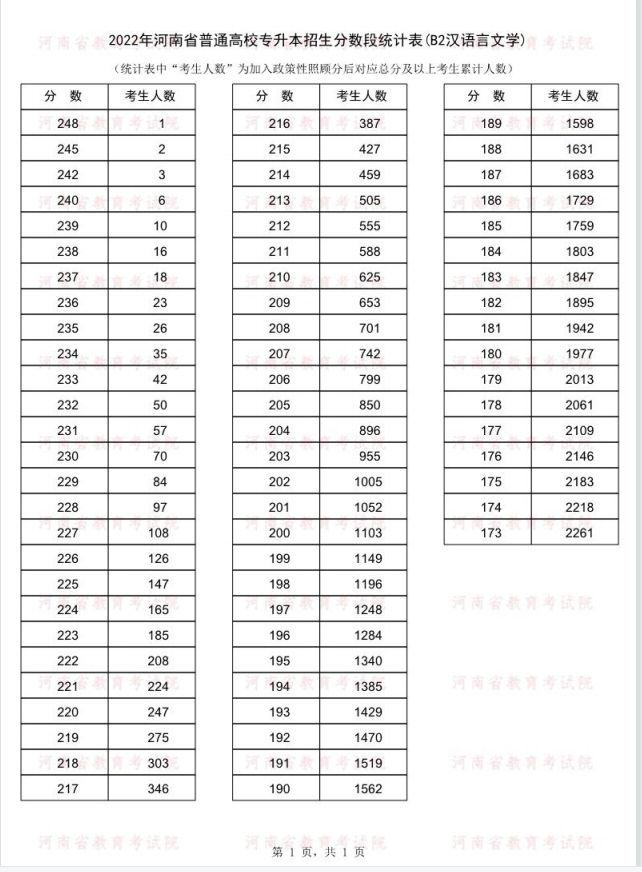 2022年河南省普通高校专升本招生分数段统计表(汉语言文学)