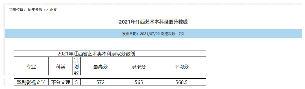 2021年江西省艺术本科录取分数线