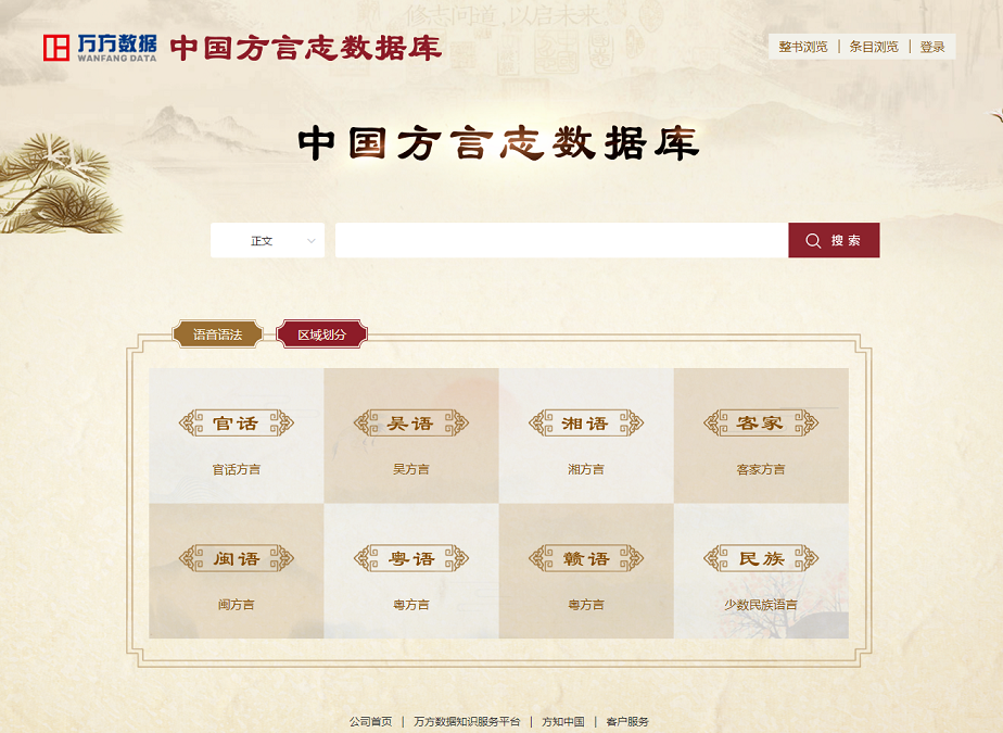 万方数据经过十几年的积累,收集了大量地方志文献资源,搭建了地方志的特色资源产品平台,为了适应文化发展的大趋势,编纂的专题数据库更能体现中华民族文化的交汇融合的硕果。《中国方言志专题数据库》从中国地方志数据库中抽取方言领域相关的志书,依照方言地域对地方志证书进行划分,对方言特点规律的条目进行专题分类标引,功能实现按照篇章节条目数据提供资源检索、阅读、下载等服务。
