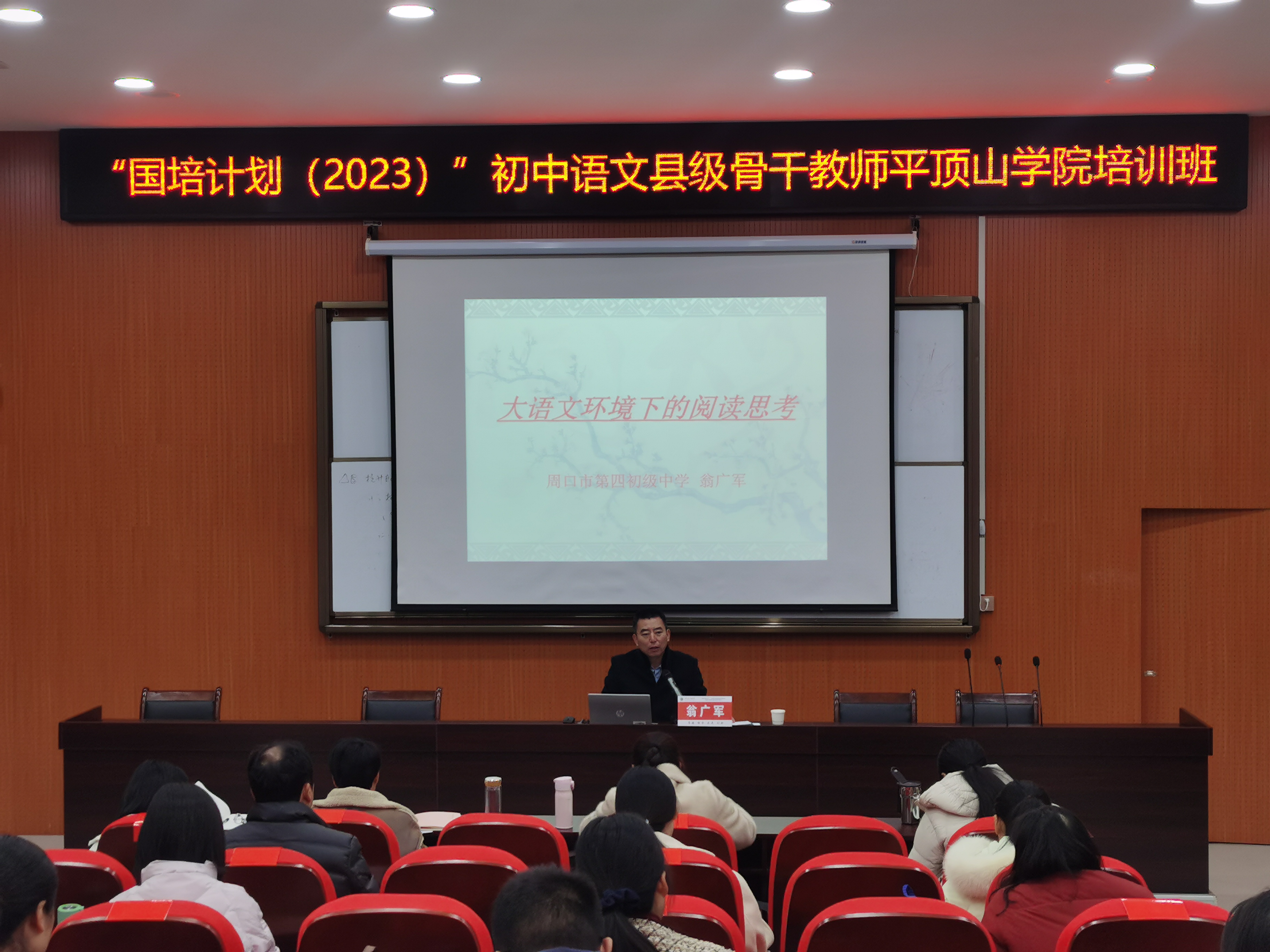 12月6日上午,周口市第四中学翁广军老师为“国培计划2023”初中语文县级骨干教师培训班学员作题为《大语文环境下的阅读思考》的专题报告,培训班学员50余人参加。